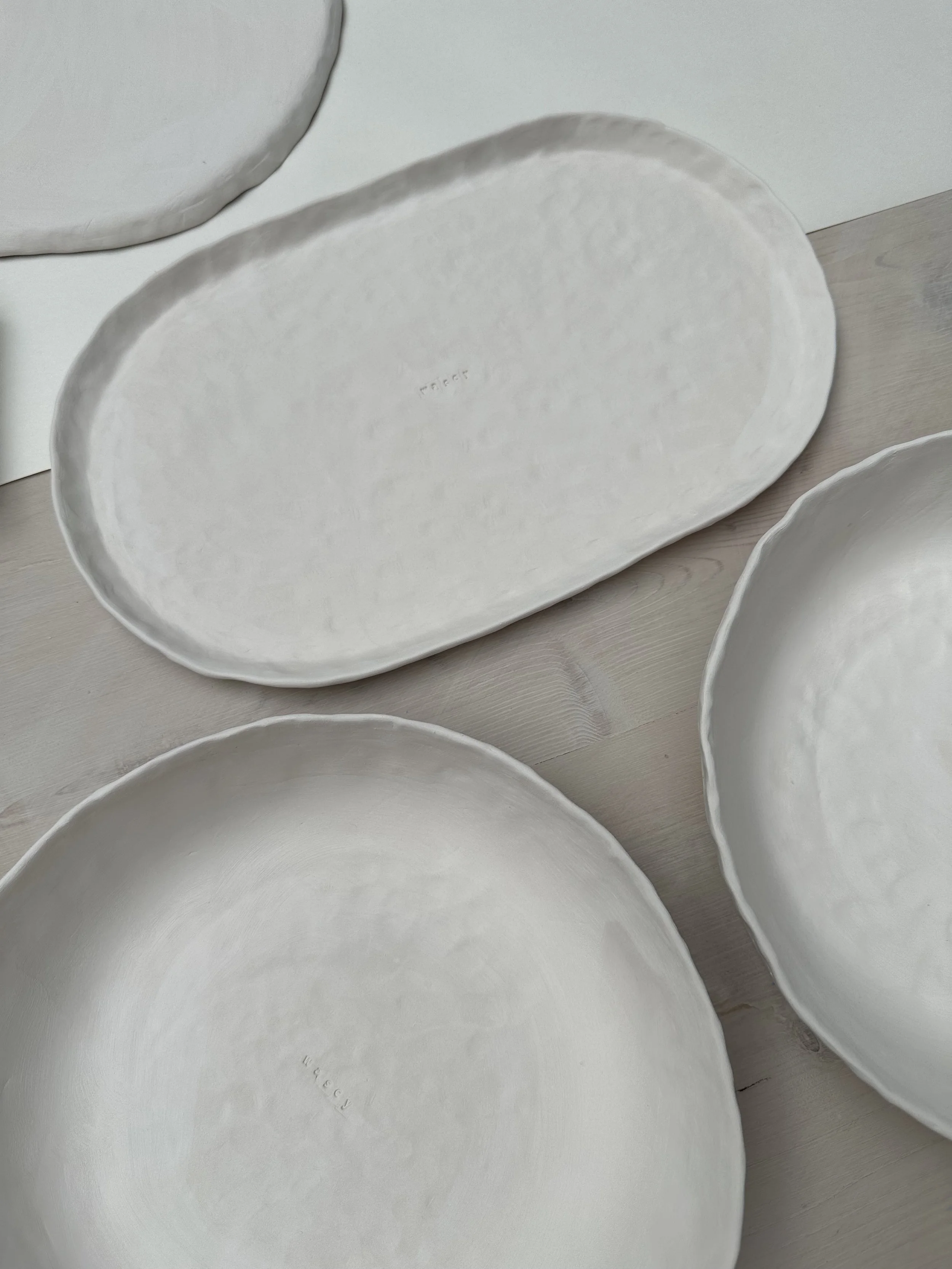 Cztery misy, cztery duże talerze, półmisek zostały ręcznie ulepiony z płata gliny tak aby było na nim widać ślady palców.